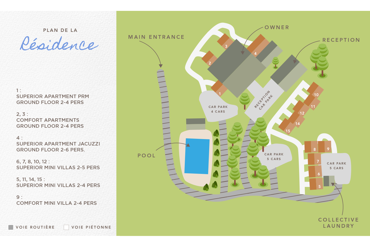 Clinging to the hillside looking down onto Propriano, in a beautiful landscape of maquis and flowers, the Residence has commanding views over the sea. The single-storey buildings have been completely renovated and boast panoramic views of the Gulf of Valinco. Tucked away in a tranquil lovely setting just 1 km from the centre of the town and the nearest beaches, Residence U Frusteru is in the perfect location. There are 10 semi attached mini villas (for 2 to 5 people) in clusters of 5, 3 apartments (for 2 to 4 people, one adapted for reduced mobility), and one apartment (for 2-6 people) on the ground floor of the owners’ villa (see the plan). Enjoy relaxation and comfort in a beautiful setting. Cool off and float in the heated swimming pool overlooking the sea, the ideal way to recharge your batteries.