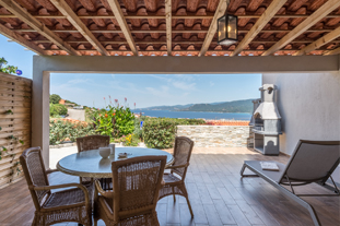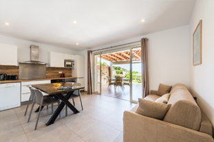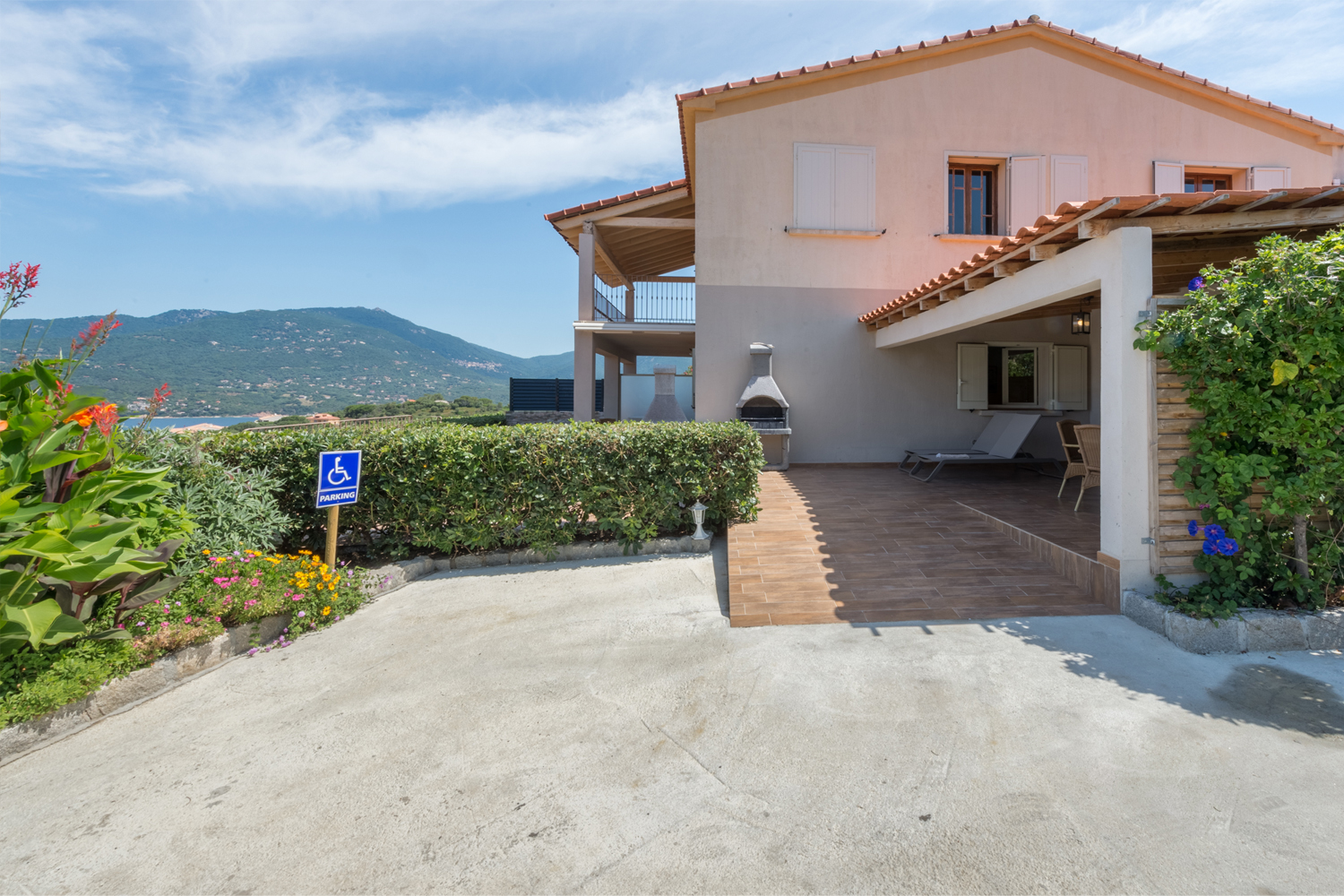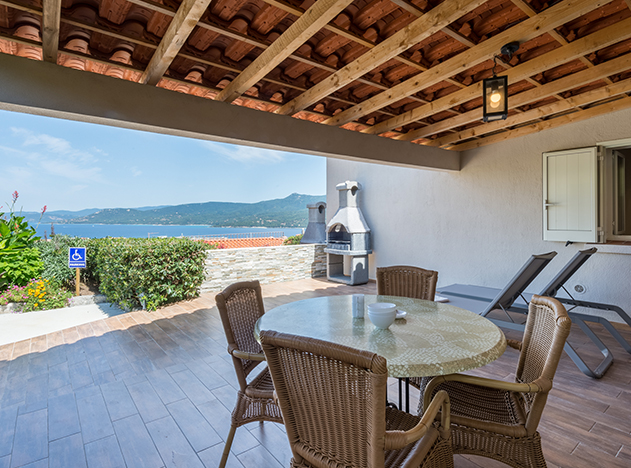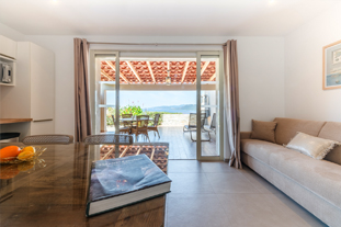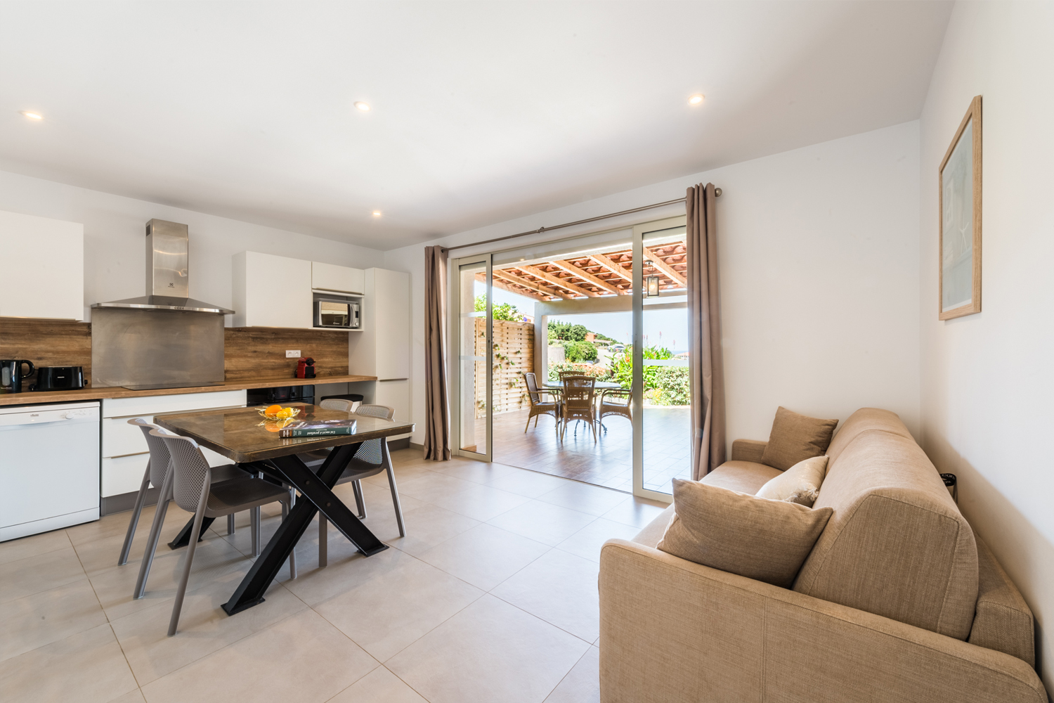 Grâce à une baie vitrée de 2 mètres, le séjour s'ouvre sur le golfe, offrant une vue exceptionnelle sur la mer. Sa terrasse privative est ombragée et est dotée d’un espace repas, de bains de soleil et d’un barbecue au charbon de bois.