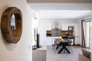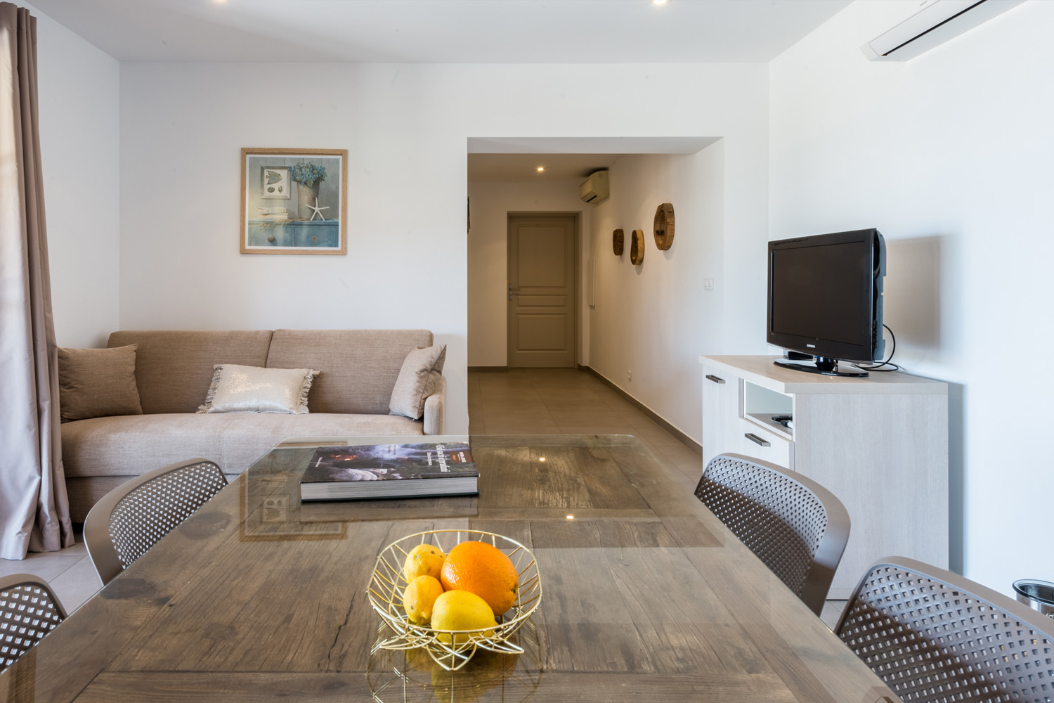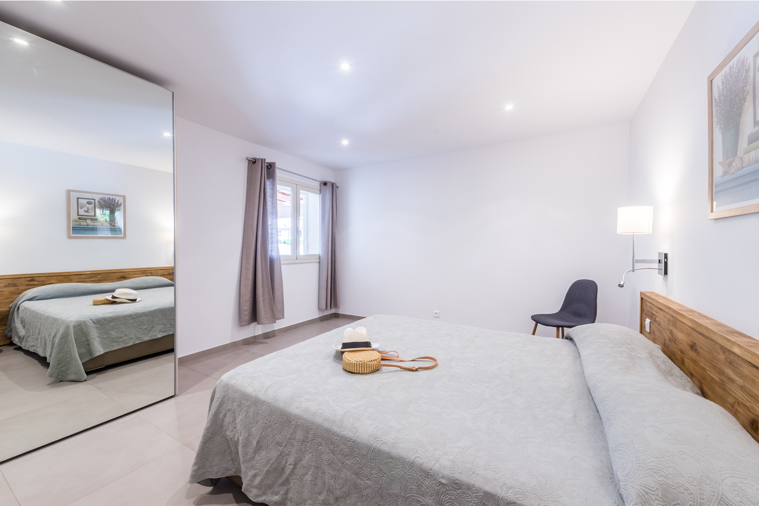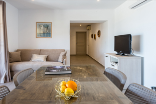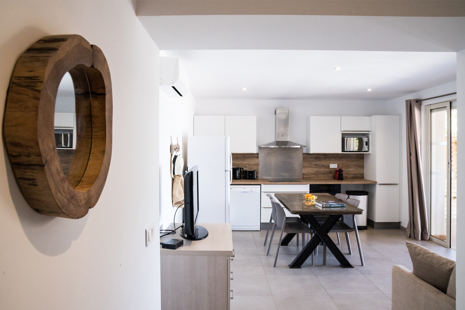 D'une superficie d'environ 60 m², pour 2 à 4 personnes, l’appartement, adapté aux normes handicapés, est de type T2 (une chambre indépendante), mitoyen, climatisé avec une chambre indépendante et un lit en 160x200cm, chevets et liseuses, coffre-fort dans armoire penderie. Dans le séjour, coin repas, canapé lit, TV écran plat, WIFI. La cuisine, ouverte sur le séjour, est entièrement équipée : grand frigo congélateur, plaques 4 feux gaz, lave-vaisselle, four électrique, four micro-ondes, bouilloire électrique, cafetière Nespresso, grille-pain, table et fer à repasser. La salle de bain, adaptée aux personnes à mobilité réduite, offre une douche italienne, WC, meuble vasque, sèche-cheveux, miroir grossissant, sèche serviettes mural.