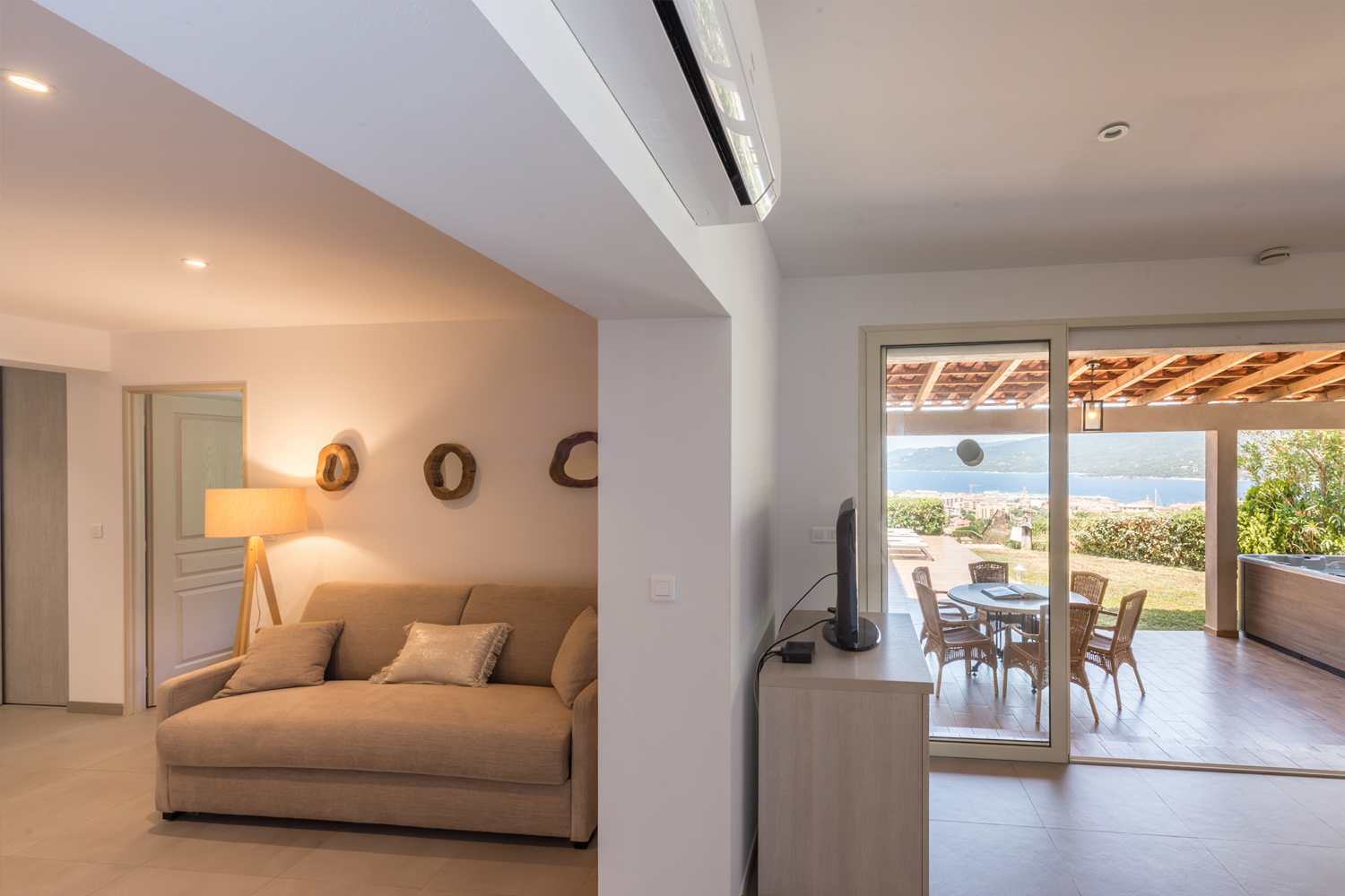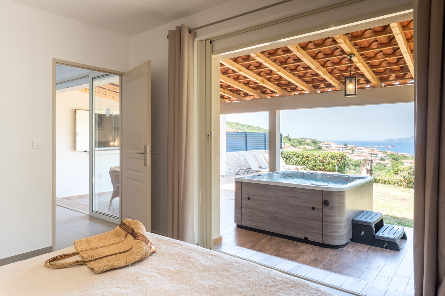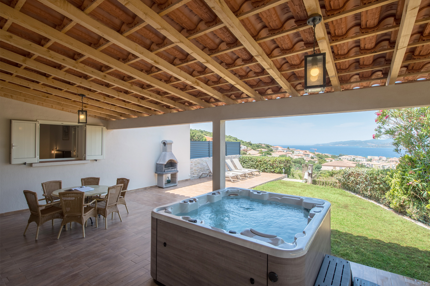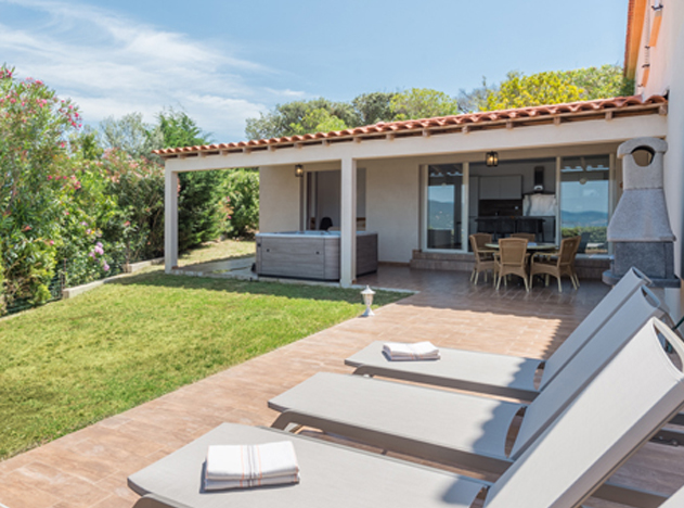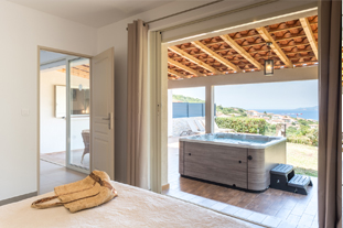 Il est face à la mer, climatisé, et dispose d'une terrasse ombragée (avec bains de soleil, espace repas, et barbecue au charbon de bois) ainsi que d'un jardin de 30m² et d’un jacuzzi.