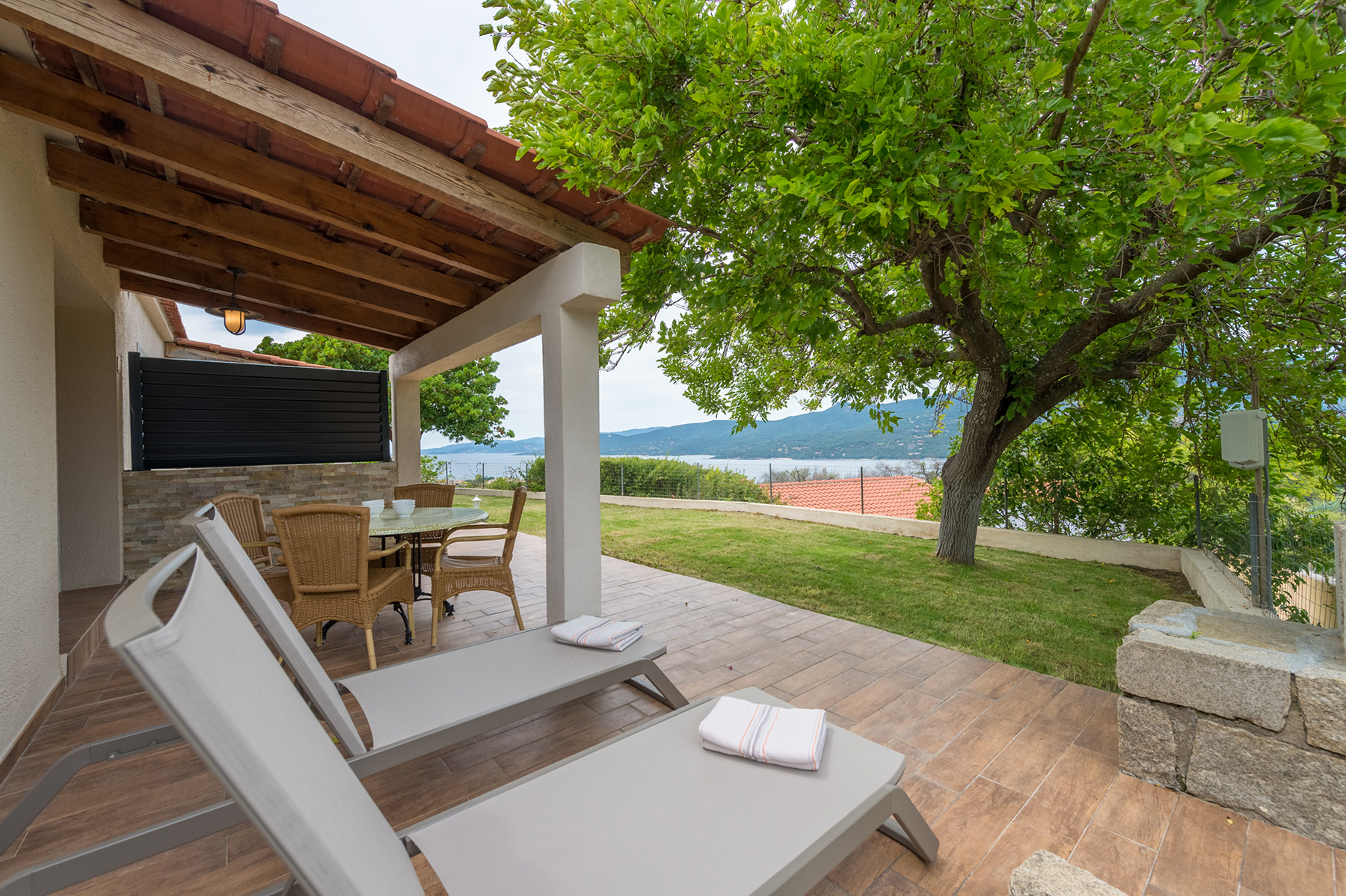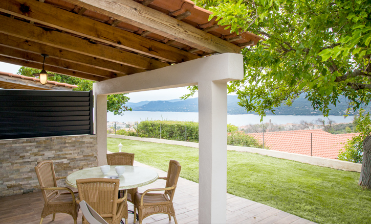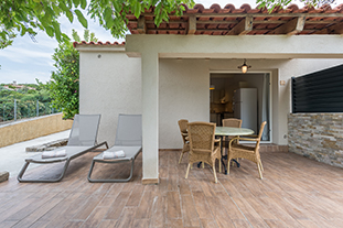 Grâce à une baie vitrée de 2 mètres, le séjour s'ouvre sur la terrasse, offrant une vue sur la mer. Sa terrasse privative est ombragée et est dotée d’un petit jardin, d’un espace repas, de bains de soleil et d’un barbecue au charbon de bois.