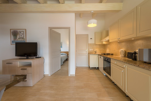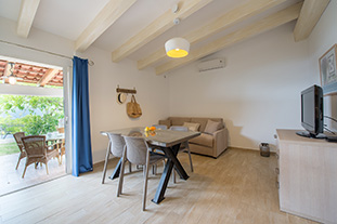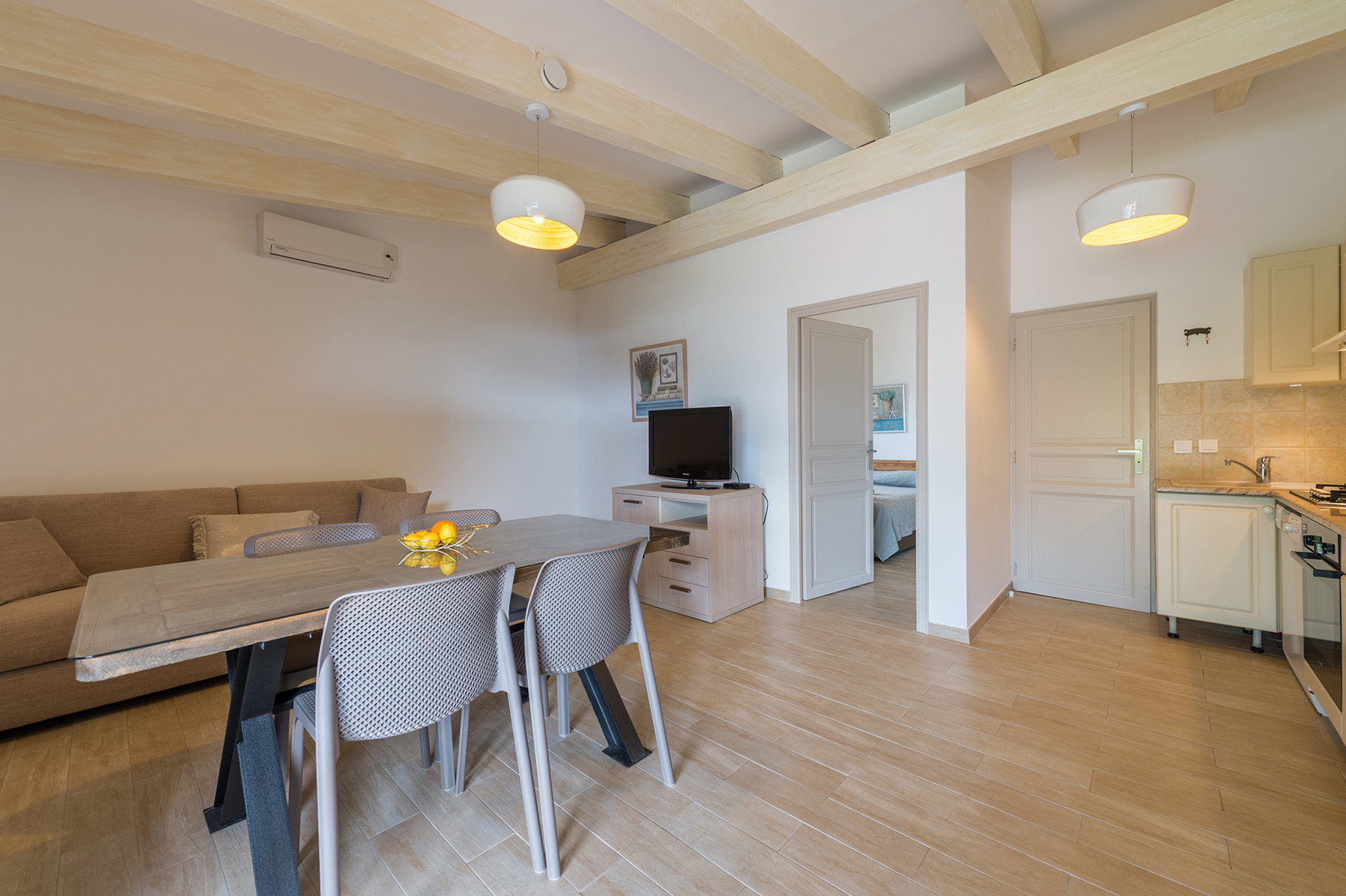 D'une superficie d'environ 45 m², pour 2 à 4 personnes, la mini villa Confort est de type T2 (une chambre indépendante), mitoyenne, climatisée, avec une chambre indépendante et un lit en 160x200cm, chevets et liseuses, coffre-fort dans armoire penderie. Dans le séjour, coin repas, canapé lit, TV écran plat, WIFI. La cuisine, ouverte sur le séjour, est entièrement équipée : grand frigo congélateur, plaques 4 feux gaz, lave-vaisselle, four électrique, four micro-ondes, bouilloire électrique, cafetière Nespresso, grille-pain, table et fer à repasser. La salle de bain offre une douche italienne avec jets massants, WC, meuble vasque, sèche-cheveux, miroir grossissant.